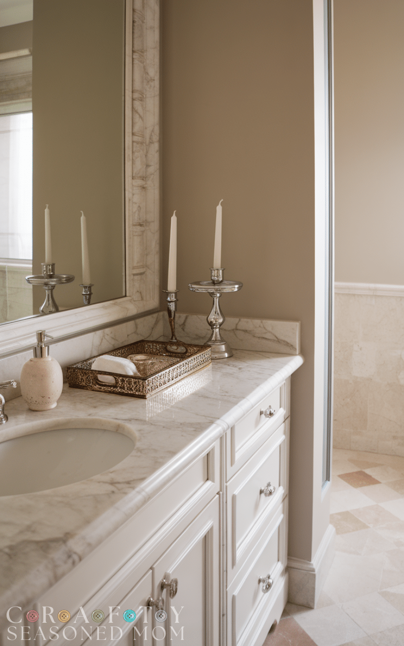 Less is often more when it comes to elegance. Keep countertops clutter-free with a few carefully chosen accessories like soap dispensers, candle holders, or decorative trays. Elegant guest bathroom ideas favor simplicity, allowing each element to stand out without overwhelming the space. Neutral or metallic accents elevate the design while maintaining a clean, sophisticated feel. By focusing on quality over quantity, you can create a serene and stylish environment that makes every guest feel pampered and ensures your bathroom stays beautiful and organized.