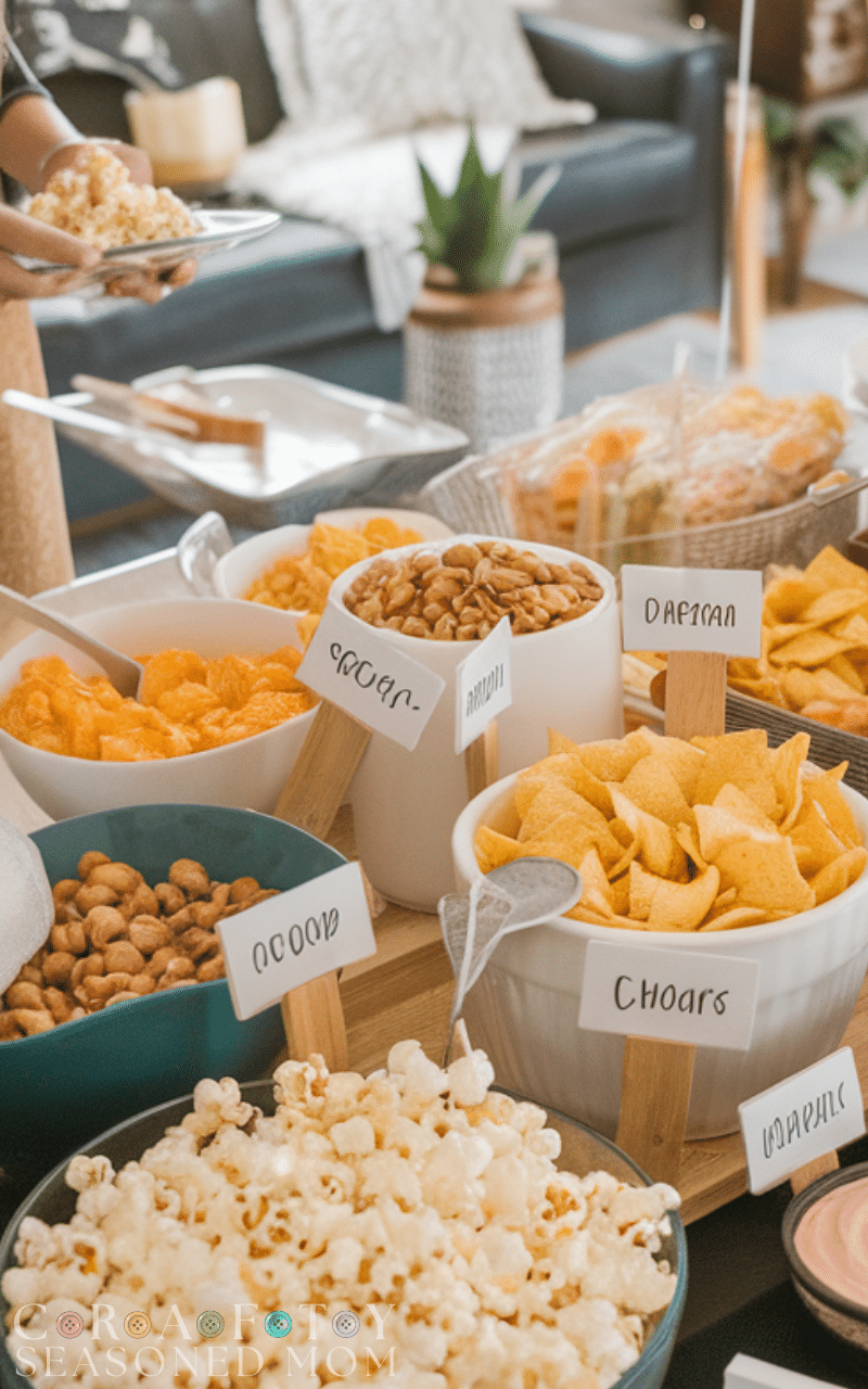 Set up a homemade snack bar with popcorn, nuts, chips, and dips. Guests can serve themselves, which saves you time and money while creating an interactive experience. A snack bar is a practical housewarming party idea on a budget, letting everyone customize their plates, and you can add small labels or decorations for a personal touch, making it feel special without breaking the bank.