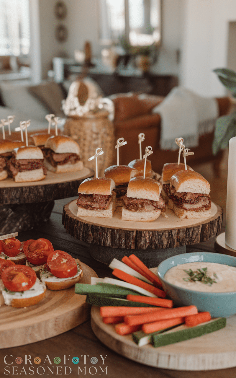 Serve simple finger foods like sliders, bruschetta, or veggie sticks with dip. They’re affordable, easy to prep, and reduce the need for fancy table settings. This housewarming party idea on a budget keeps the menu approachable, tasty, and stress-free for the host while keeping guests happy and satisfied.