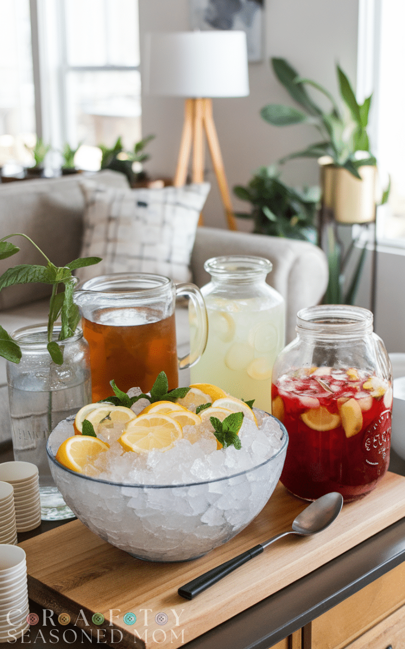 Create a DIY drink station with water, iced tea, lemonade, or a signature punch. Add some fruit slices or herbs for flair. This housewarming party idea on a budget allows guests to serve themselves while looking attractive and thoughtful, saving money on bottled beverages or cocktails without sacrificing style.
