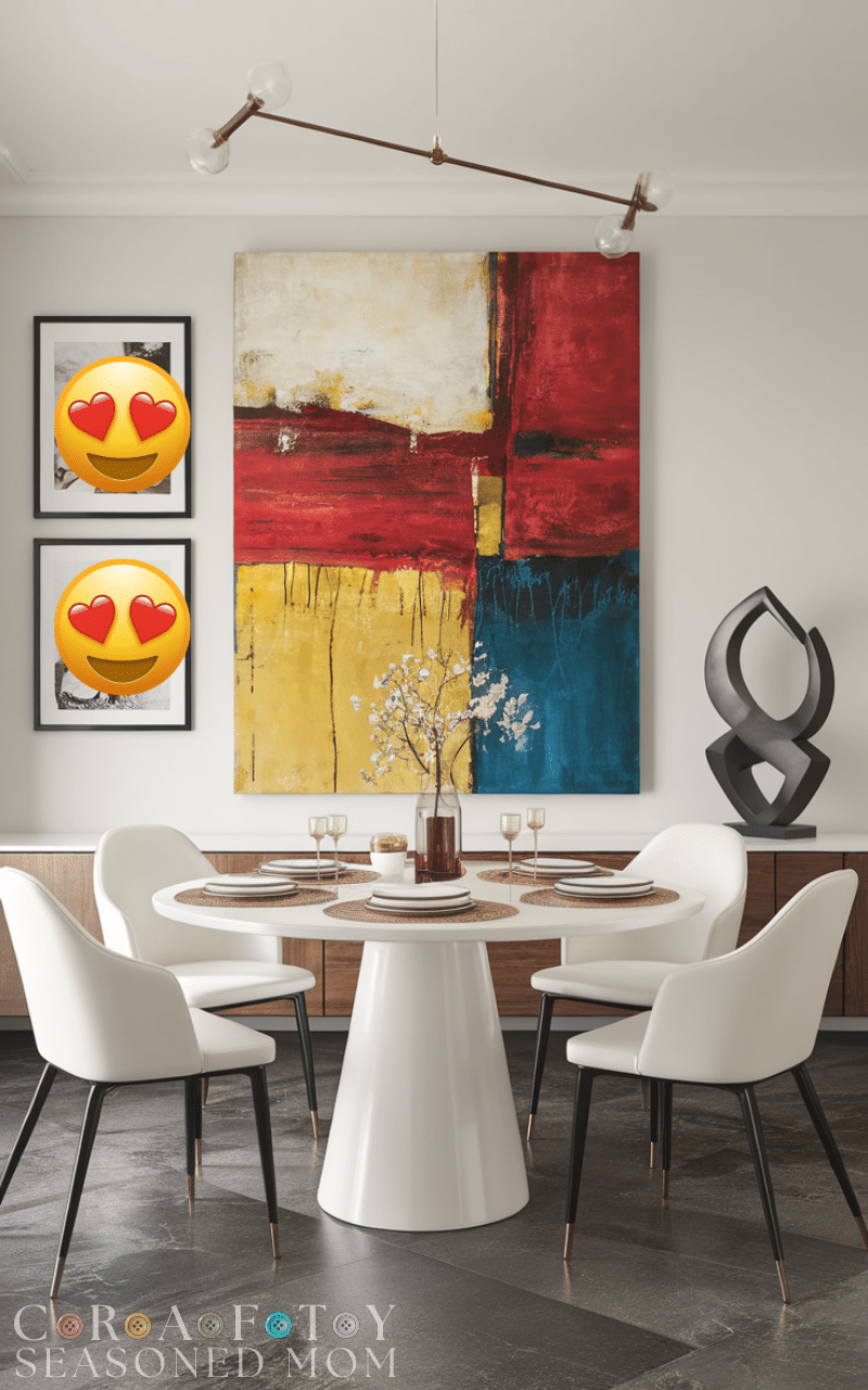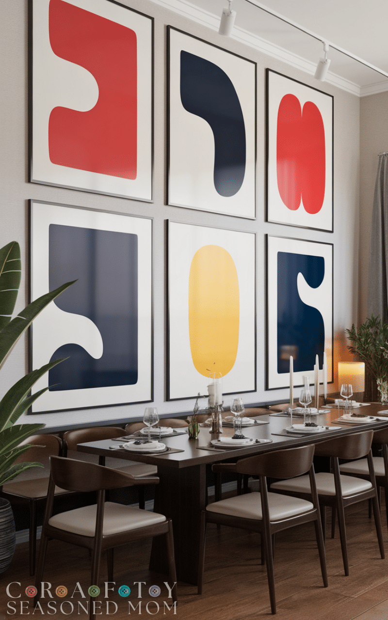 Use a gallery wall or large framed pieces to create interest without overcrowding the room. Modern artwork instantly updates the space. This approach is ideal for modern dining room ideas on a budget, offering high visual impact for low investment.