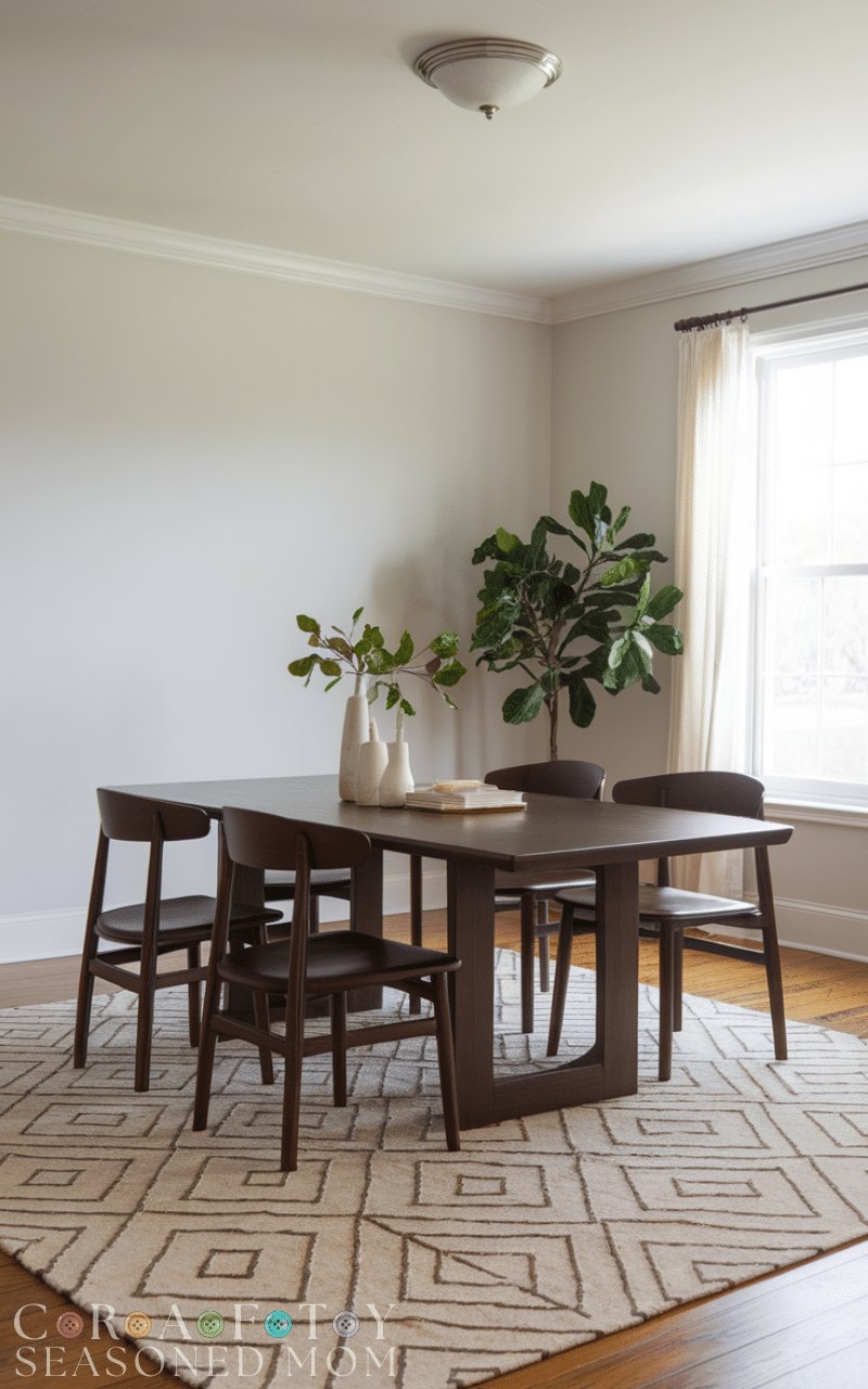 Place a geometric or solid-colored area rug under your dining table to define the space. Choose durable, easy-to-clean materials to handle spills. Rugs are a simple and stylish modern dining room idea on a budget that adds warmth and texture.