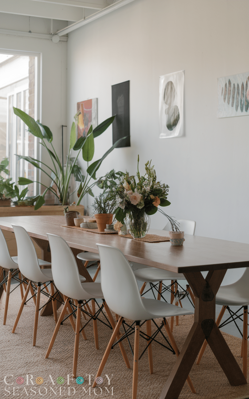 Add potted plants or a centerpiece with fresh flowers to bring life to your dining area. Greenery softens clean modern lines and adds color naturally. Incorporating plants is an affordable modern dining room idea on a budget that enhances the ambiance effortlessly.