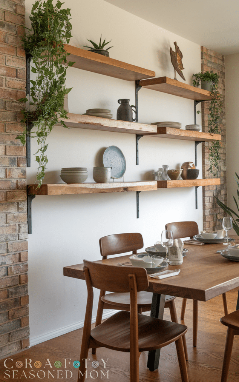 Use floating shelves to display dinnerware, decorative objects, or plants. This creates functional wall space without bulky cabinets. Floating shelves are a practical and chic modern dining room idea on a budget, keeping the room stylish and organized.