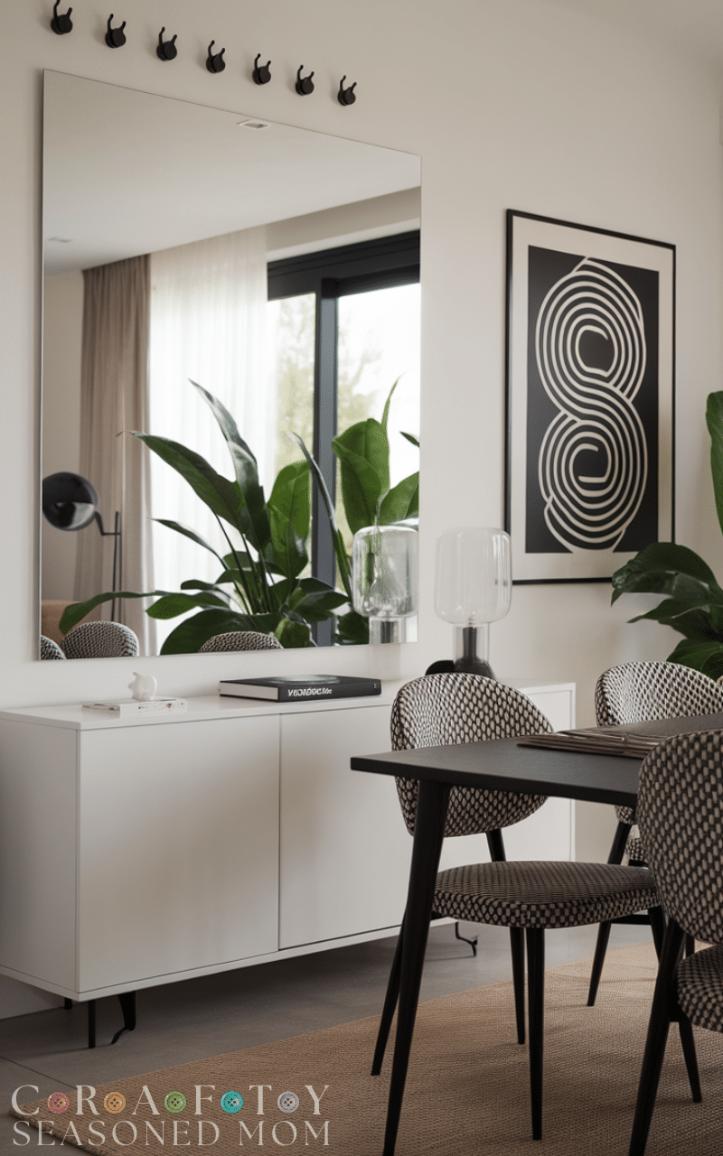 Decorate with modern art prints or a large mirror to open up the space. Mirrors reflect light and make the dining area feel bigger, while artwork adds personality. This stylish addition is perfect for modern dining room ideas on a budget, giving the room character without major renovations.