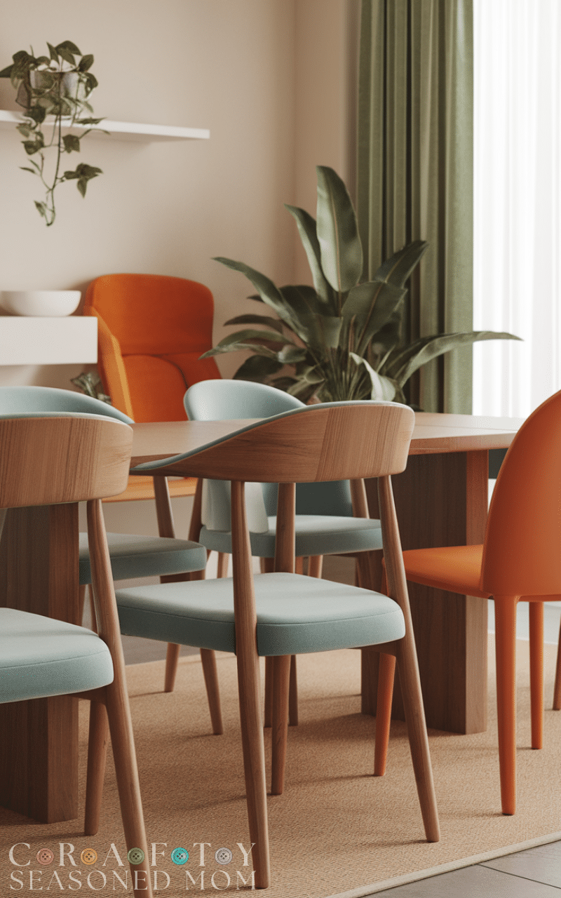 Combine different chair styles or colors for a playful yet modern look. Mixing upholstered and wooden chairs or bold accent chairs adds personality. This creative idea works perfectly for modern dining room ideas on a budget, letting you achieve a designer feel without spending on a full matching set.
