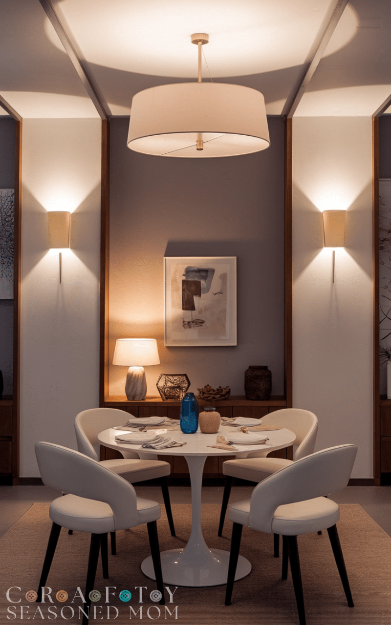 Combine overhead lighting with wall sconces or table lamps for ambiance. Layered lighting enhances the modern look and allows flexibility for different moods. It’s a stylish modern dining room idea on a budget that adds warmth and depth.