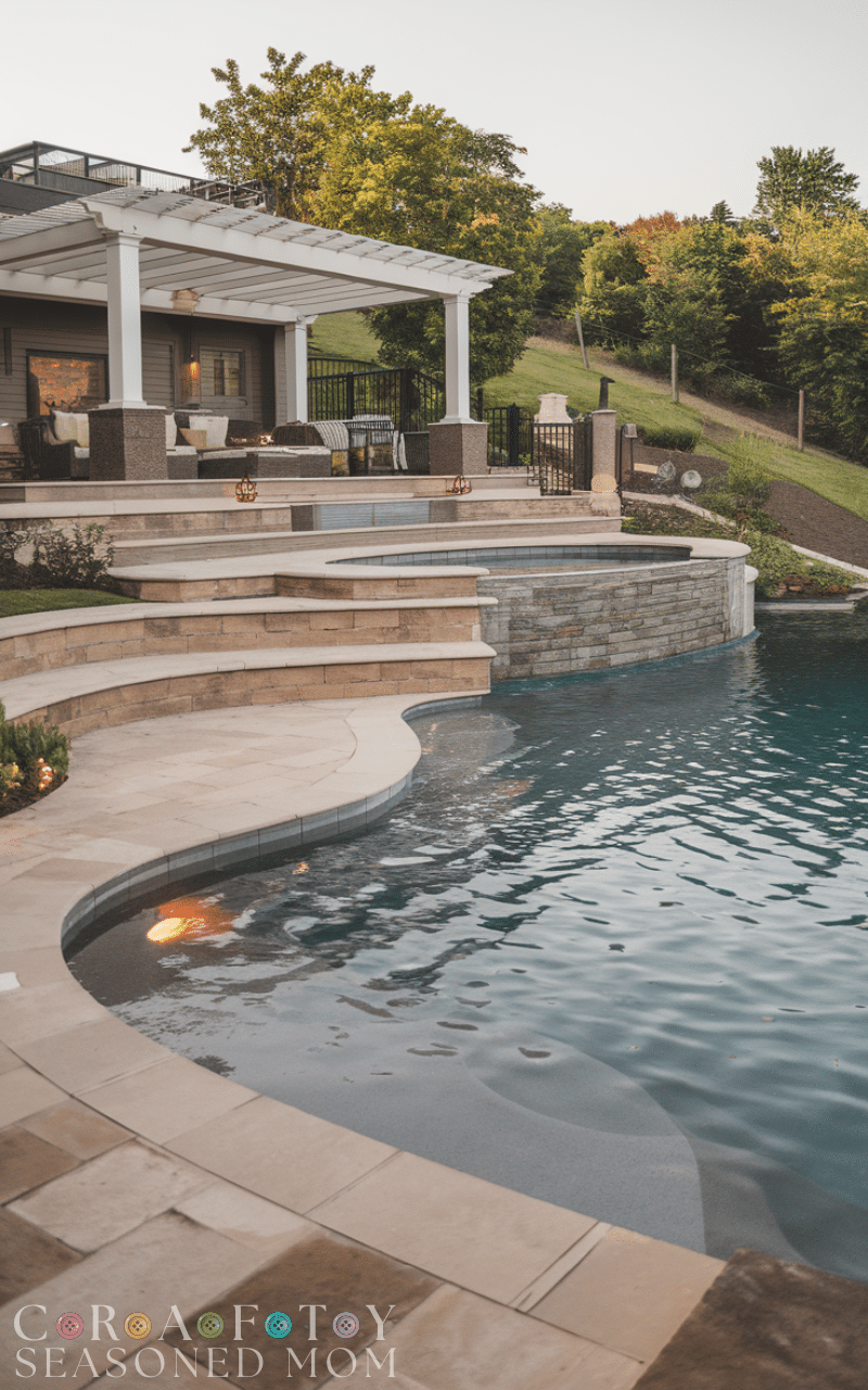 Multi-level layouts are a creative pool deck that adds dimension and visual interest. By creating different levels, you can separate lounging, dining, and swimming areas. These pool deck ideas work especially well in sloped backyards. They allow for built-in steps, seating, and decorative lighting. Multi-level pool deck ideas maximize space while creating a luxurious and organized outdoor setting.