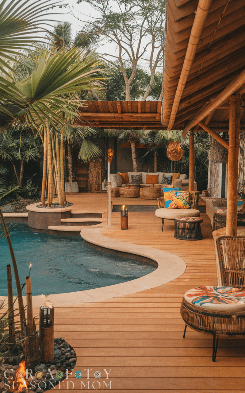 If you love vacation vibes, a tropical pool deck is perfect for your backyard. Incorporate bamboo accents, palm plants, and warm-toned decking materials to create a resort-like atmosphere. These pool deck ideas often include tiki torches, rattan furniture, and colorful cushions. The goal is to design a relaxing escape right at home. Tropical pool deck ideas transform ordinary pools into paradise-inspired retreats where relaxation comes naturally.