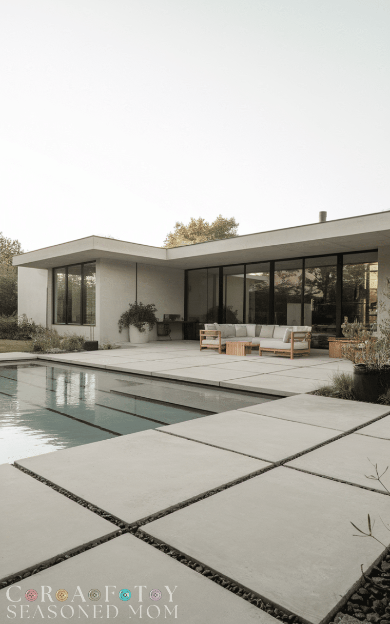 Simple concrete slab designs are clean and modern pool deck ideas. Their smooth finish gives a contemporary look that works well with minimalist homes. You can enhance the pool deck with subtle coloring or brushed textures for added style. They are affordable, durable, and easy to maintain. Adding outdoor furniture and greenery helps soften the appearance. Minimalist pool deck ideas are perfect if you prefer simplicity and practicality combined with modern elegance.