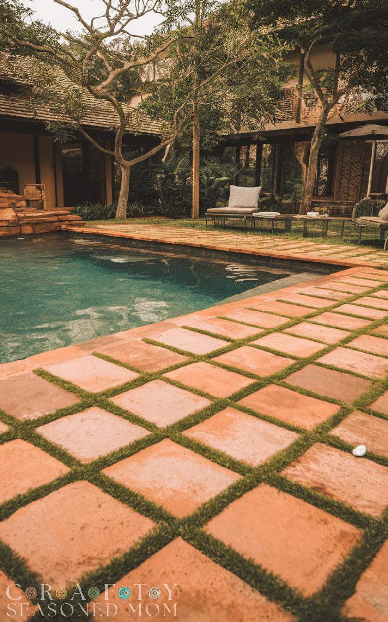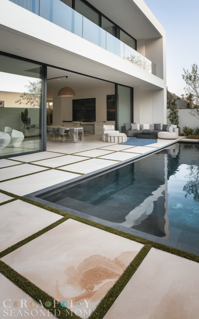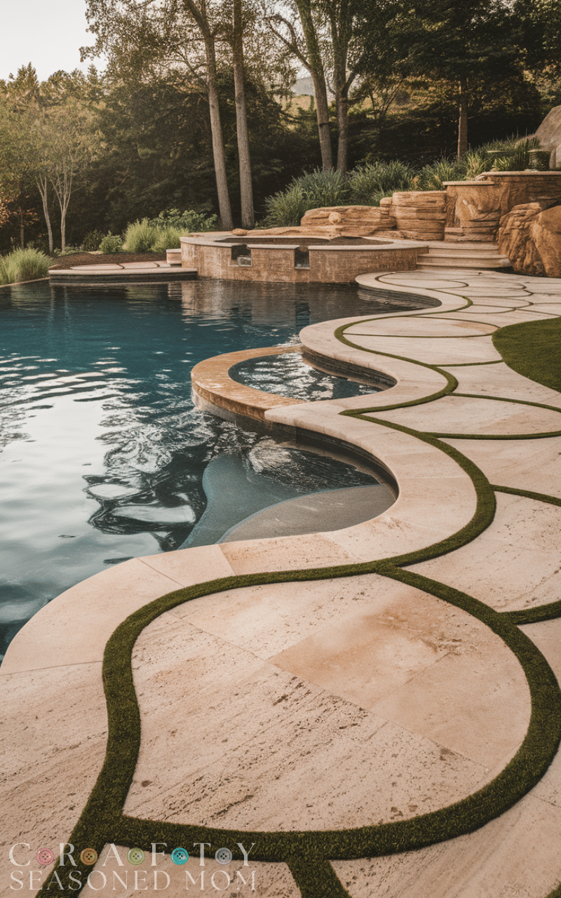Mixing grass and stone is a fresh take on a pool deck. Alternating pavers with green patches creates a natural and airy look. These pool deck ideas work well in eco-friendly landscapes and contemporary gardens. They soften the hardscape while maintaining structure. This combination creates a relaxing environment that blends seamlessly with nature.