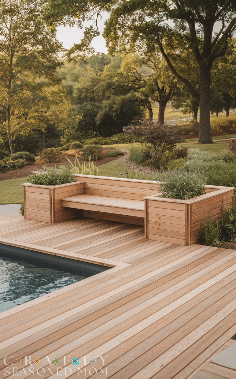 Wooden designs are classic pool deck ideas that never go out of style. Natural wood adds warmth and creates a cozy, spa-like atmosphere around your swimming area. You can choose pressure-treated lumber, cedar, or composite decking for better durability. These pool decks work beautifully in both modern and rustic homes, offering a smooth surface that feels comfortable under bare feet. Adding built-in benches or planters enhances the look even more. Regular sealing and maintenance will keep wooden pool deck ideas looking fresh and inviting for years.