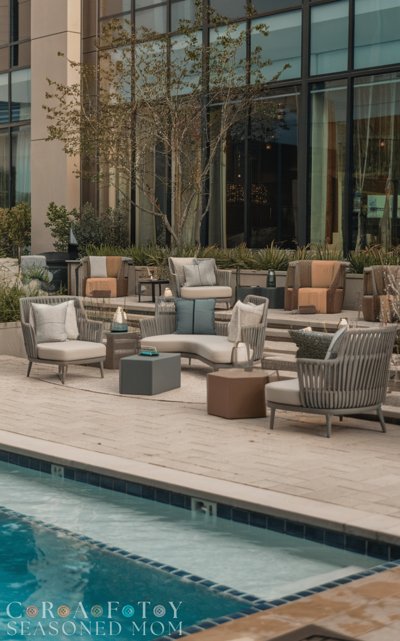 Creating a lounge-inspired setup is one of the most functional pool decks. Add comfortable seating, outdoor sofas, and side tables to encourage relaxation. These pool deck ideas turn your backyard into an entertainment hub for gatherings and parties. Neutral tones with cozy cushions enhance comfort. Lounge-focused pool deck ideas make your pool area feel like an extension of your living room.