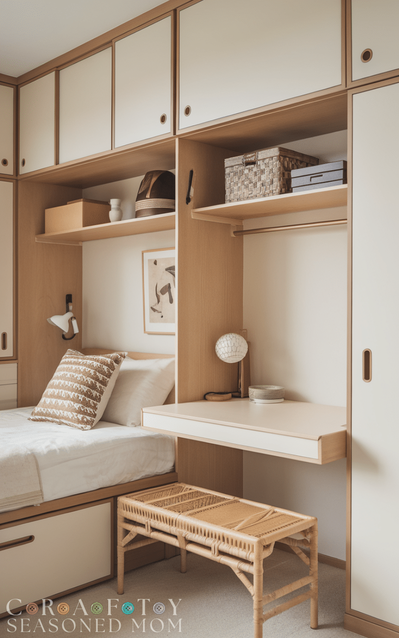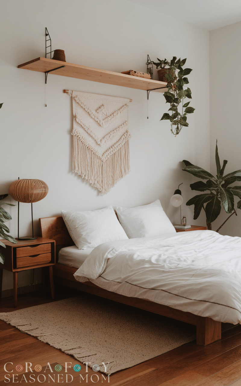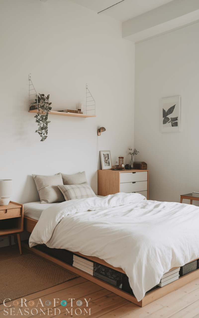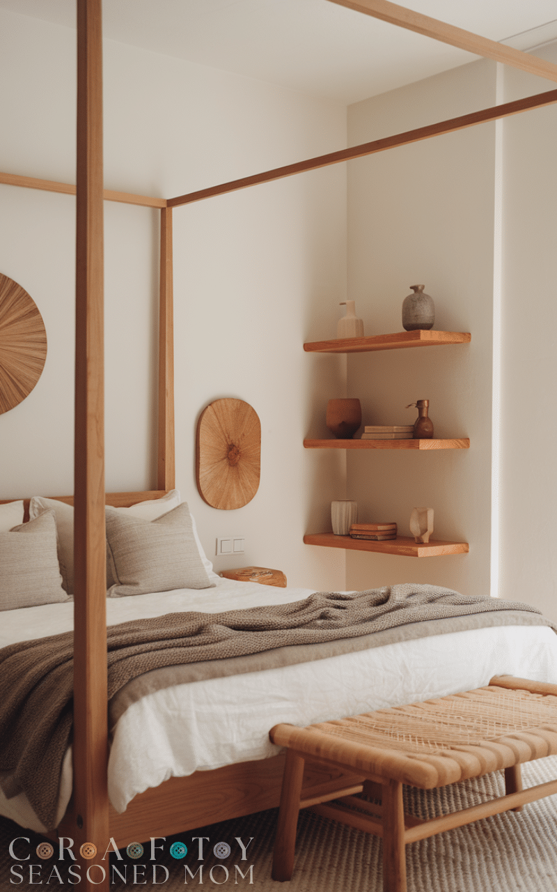 Minimalist storage solutions help maintain the uncluttered feel of relaxing Japandi bedroom designs. Floating shelves, under-bed storage, and discreet drawers keep belongings organized without taking up visual space. Choosing wooden or neutral-toned storage pieces ensures they blend seamlessly with the room’s aesthetic. By reducing clutter, these storage ideas enhance the room’s sense of calm, allowing the natural beauty of your decor to shine. Minimalist storage not only keeps the bedroom tidy but also supports mindfulness, creating an environment that’s peaceful and relaxing while staying true to the Japandi style.