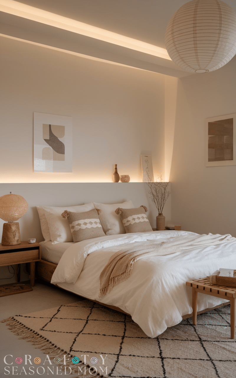 Soft, layered lighting is essential in relaxing Japandi bedroom designs. Combining paper lanterns, wooden lamps, and recessed lighting creates a warm, inviting atmosphere. Soft light reduces stress and enhances the cozy feel of the room. Layering different light sources allows you to adjust the mood for relaxation or reading. Using dimmers or lamps with natural textures adds visual interest without disrupting the minimalist vibe. Thoughtful lighting complements neutral tones and natural materials, highlighting the Japandi balance of simplicity and warmth, transforming your bedroom into a serene, relaxing retreat that promotes rest and mindfulness.