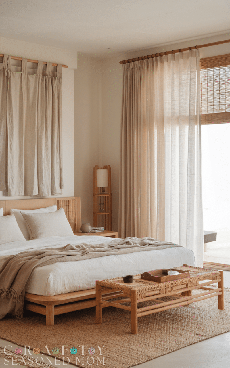 Simple window treatments are essential for relaxing Japandi bedroom designs. Lightweight linen curtains, bamboo shades, or neutral roller blinds allow soft natural light to filter in while maintaining privacy. Minimalist designs ensure that the windows do not overpower the room, preserving a clean and airy look. Natural fabrics tie into the Japandi emphasis on textures, complementing wooden furniture and neutral palettes. Properly chosen window treatments control ambiance and temperature while enhancing tranquility. By keeping designs understated and functional, you maintain the balance of simplicity and warmth, making your bedroom a serene and inviting retreat.