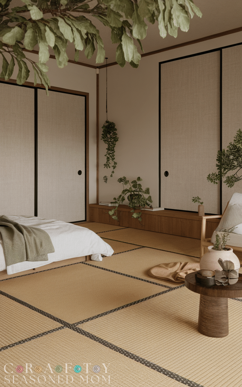 Tatami-inspired flooring adds authenticity to relaxing Japandi bedroom designs. Natural straw mats or soft beige rugs mimic traditional Japanese tatami, offering comfort underfoot and visual warmth. This type of flooring complements neutral palettes and wooden furniture, enhancing the minimalist aesthetic while promoting relaxation. Tatami-inspired textures also encourage a connection with nature and mindfulness, creating a soothing foundation for your bedroom. Its subtle design ensures that other elements, like furniture and decor, remain the focus. Incorporating tatami-inspired flooring strengthens the Japandi blend of Japanese minimalism and Scandinavian comfort, crafting a cozy, calming environment.
