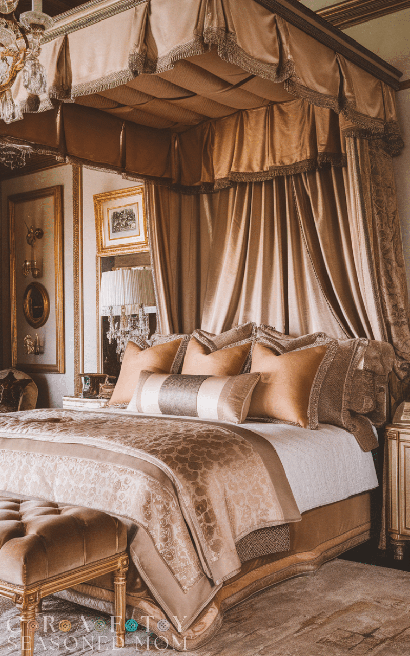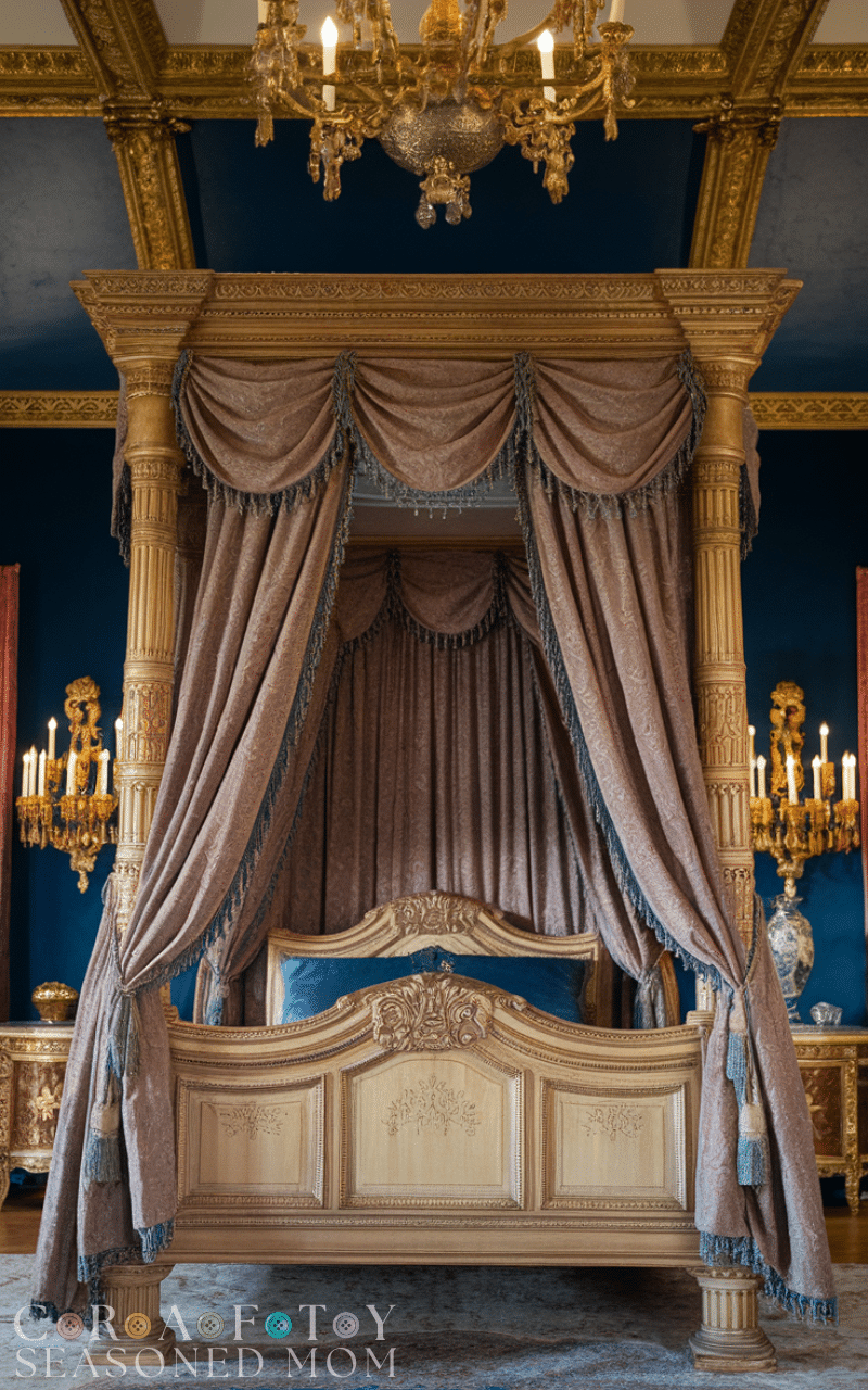 A grand canopy bed instantly defines royal bedroom ideas with its dramatic presence and elegant structure. Choose a carved wooden or upholstered canopy frame and add flowing sheer or velvet drapes for a majestic feel. This design creates a focal point that transforms the entire room into a palace-like sanctuary. Pair it with layered bedding in rich fabrics to enhance the royal bedroom ideas aesthetic. The canopy not only adds height and drama but also creates a cozy and private sleeping space that feels indulgent and luxurious.