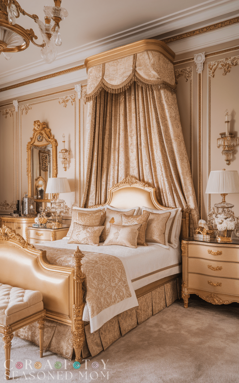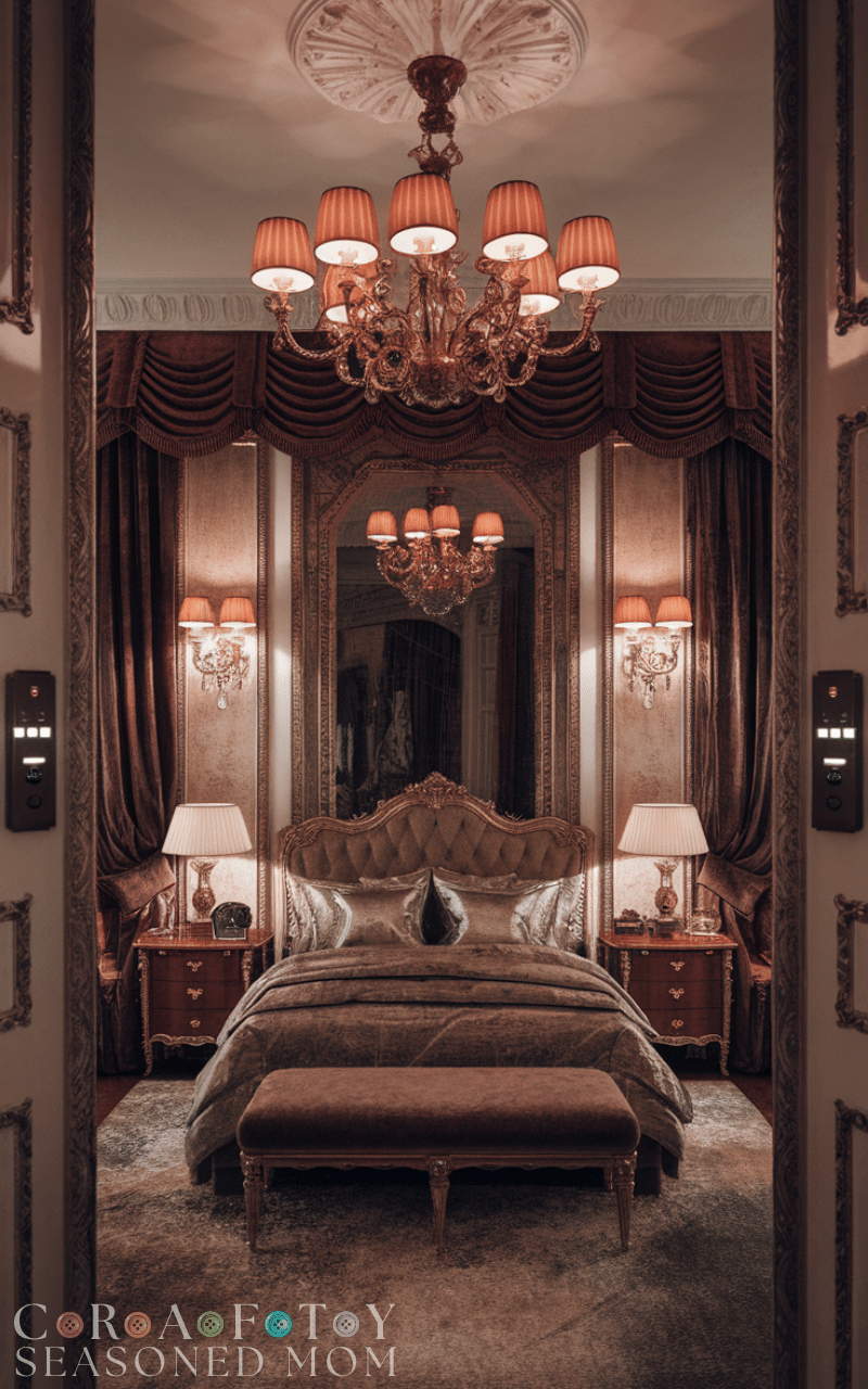 A large ornate mirror enhances royal bedroom ideas by reflecting light and adding grandeur. Choose a gold or silver carved frame to match the room’s theme. Position it strategically to make the space appear larger and brighter. Mirrors also highlight other decorative features, amplifying their beauty. This elegant addition strengthens the regal aesthetic while remaining functional. Including a statement mirror ensures your royal bedroom ideas feel open, bright, and majestic.