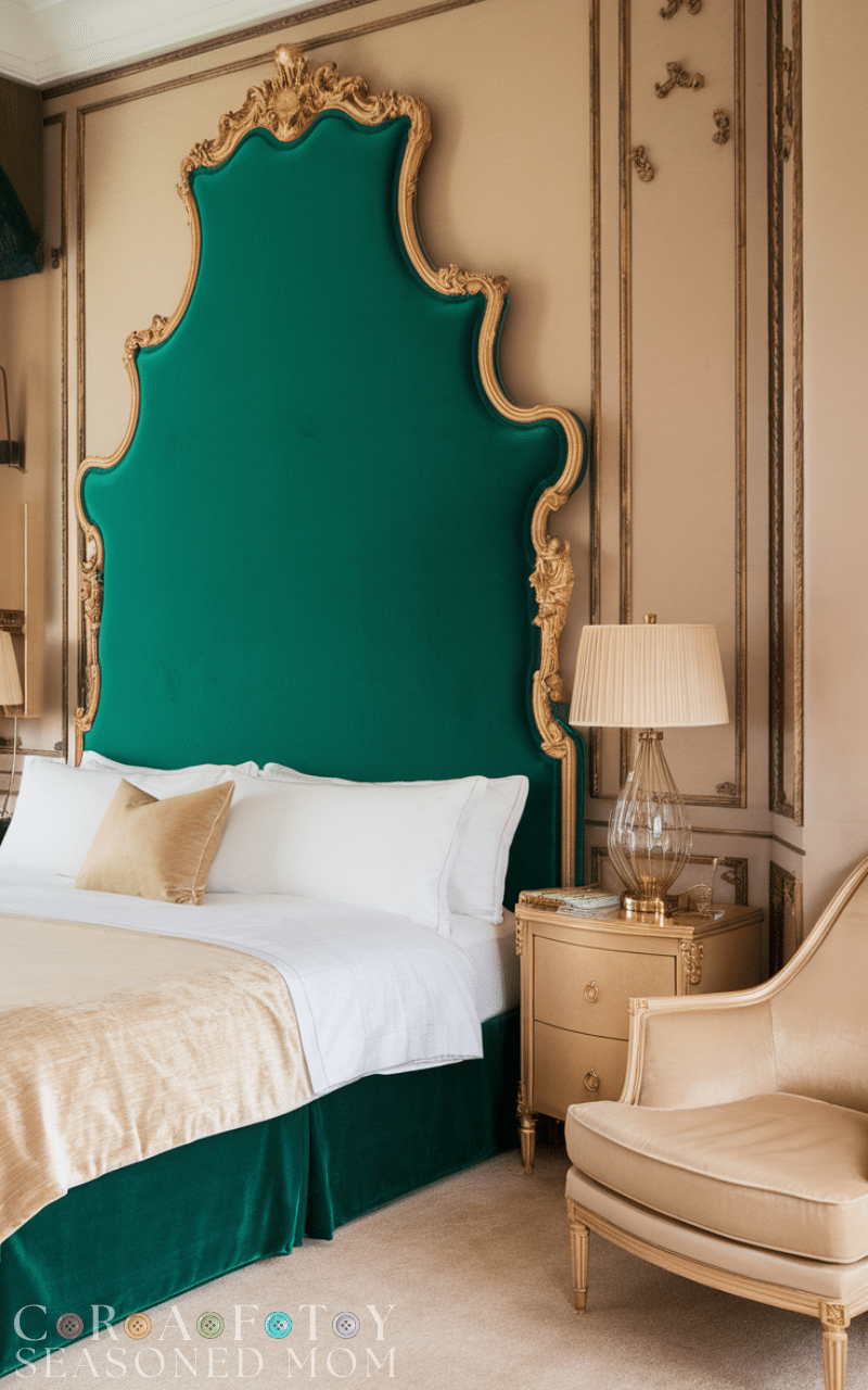 A tall velvet upholstered headboard adds softness and grandeur to royal bedroom ideas. Deep jewel tones like emerald, sapphire, or burgundy enhance the luxurious feel. The plush texture creates comfort while also serving as a bold statement piece. Pair it with gold or brass accents for a regal finish. Velvet naturally reflects light, adding depth and dimension to the space. This simple addition can completely transform ordinary décor into stunning royal bedroom ideas that feel rich and welcoming.