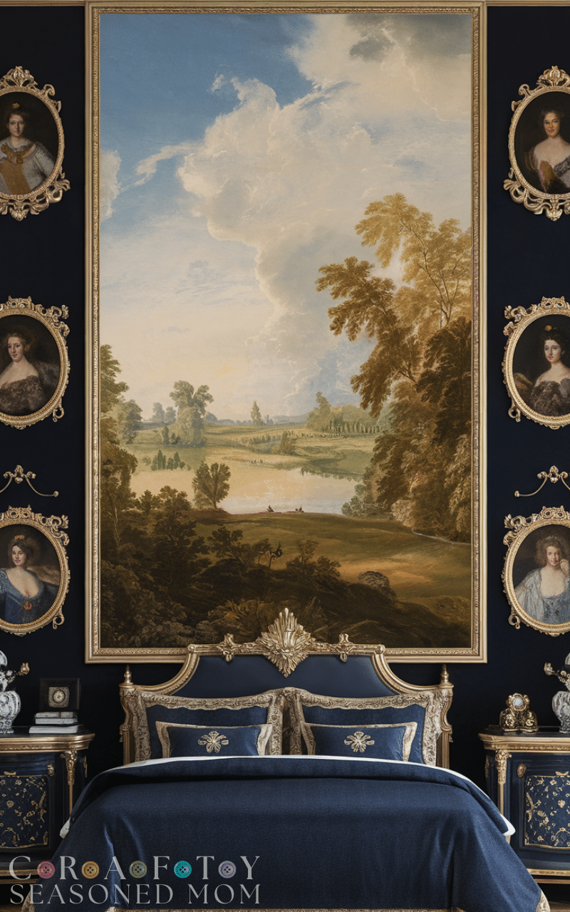 Large framed artwork or classic-style portraits enhance royal bedroom ideas by adding personality and sophistication. Choose pieces with ornate frames to maintain consistency. Art adds depth and storytelling to the room’s design. Positioning artwork thoughtfully creates balance and visual interest. Incorporating elegant wall décor ensures your royal bedroom ideas feel curated and complete.