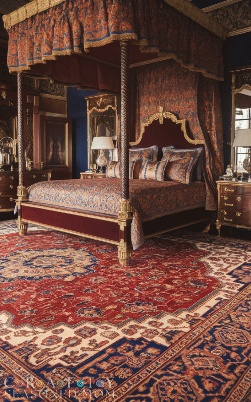 A soft, plush area rug grounds royal bedroom ideas and adds warmth. Choose designs with intricate patterns or subtle elegance to match the décor. Rugs soften hardwood floors and create a cozy foundation for furniture. Selecting the right size ensures the room feels proportioned and harmonious. Including a luxurious rug enhances comfort while strengthening the regal aesthetic of your royal bedroom ideas.