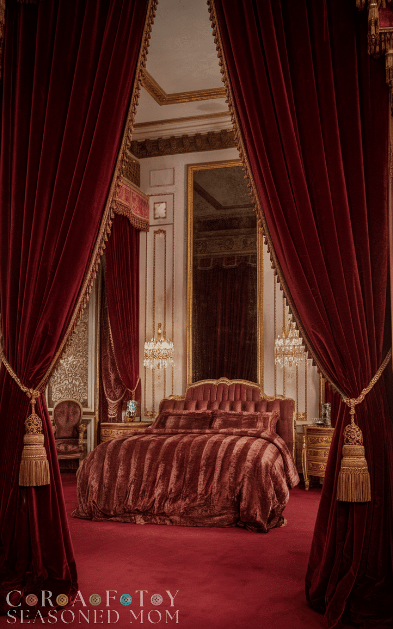 Heavy curtains made of velvet or brocade complete royal bedroom ideas with dramatic elegance. Floor-to-ceiling drapes create height and enhance the luxurious ambiance. Choose colors that complement your bedding and furniture for cohesion. Adding tiebacks with decorative tassels further emphasizes the royal theme. Thick curtains also provide privacy and light control. Incorporating regal window treatments is a simple yet powerful way to refine your royal bedroom ideas.