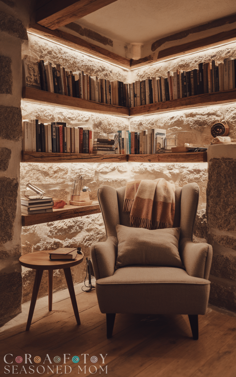 A small reading corner with a comfortable chair, wooden side table, and soft lighting perfectly completes rustic basement ideas. Add shelves filled with books and a warm blanket to enhance the inviting feel. Rustic basement ideas that include quiet spaces encourage relaxation and make the basement feel personal and special, transforming it into a true retreat within your home.