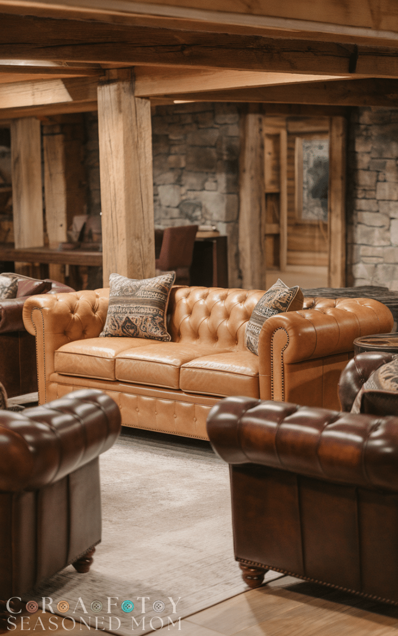 Leather sofas and armchairs are staples in rustic basement ideas because they add texture and comfort. Rich brown or tan leather pairs beautifully with wood and stone elements. Add patterned cushions and a soft area rug to balance the strong materials. Rustic basement ideas featuring leather seating feel both rugged and cozy, creating a comfortable space for watching movies or spending quiet evenings.