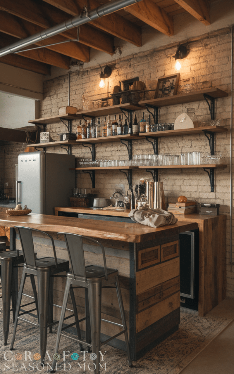 Transform your basement into an entertainment hub with a rustic bar setup. Wooden countertops, industrial metal stools, and open shelving create a welcoming space for hosting friends. Rustic basement ideas with a bar area feel relaxed and stylish at the same time. Add pendant lighting with warm bulbs to complete the look. This setup works perfectly for family gatherings, game nights, or weekend relaxation.