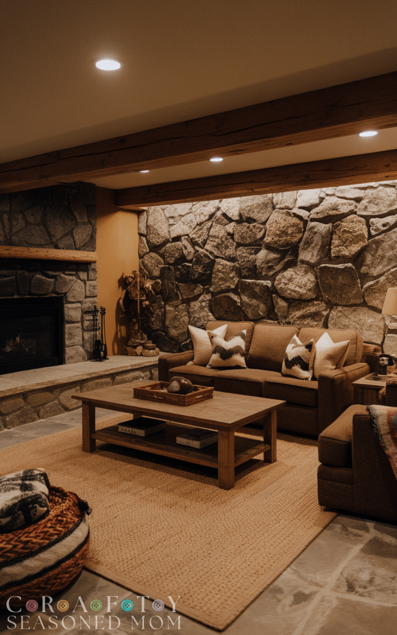 A stone accent wall is a classic feature in rustic basement ideas. Natural or faux stone creates texture and makes the room feel grounded and earthy. Place it behind a fireplace, television, or seating area for a dramatic focal point. The rough surface contrasts beautifully with soft sofas and warm rugs. Rustic basement ideas that include stone elements feel timeless and elegant, and they help bring the outdoors inside, which is essential for achieving a true rustic atmosphere.