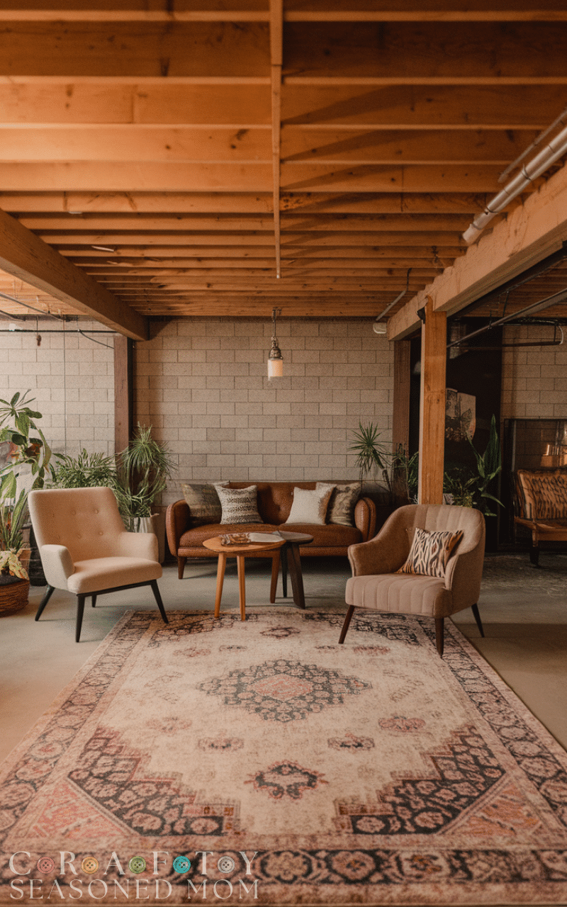 Area rugs are essential in rustic basement ideas because they add warmth and comfort underfoot. Choose natural fibers or vintage-inspired patterns to enhance the rustic theme. Rugs also help define seating areas and improve acoustics in basements. Rustic basement ideas feel more complete and inviting when layered with soft textures.