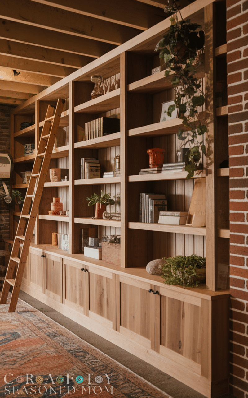 Built-in wooden shelves provide both style and storage in rustic basement ideas. They can display books, decorative items, and plants while keeping the space organized. Natural wood shelving adds warmth and complements other rustic elements. Rustic basement ideas that include built-ins feel polished and intentional without losing their cozy charm.