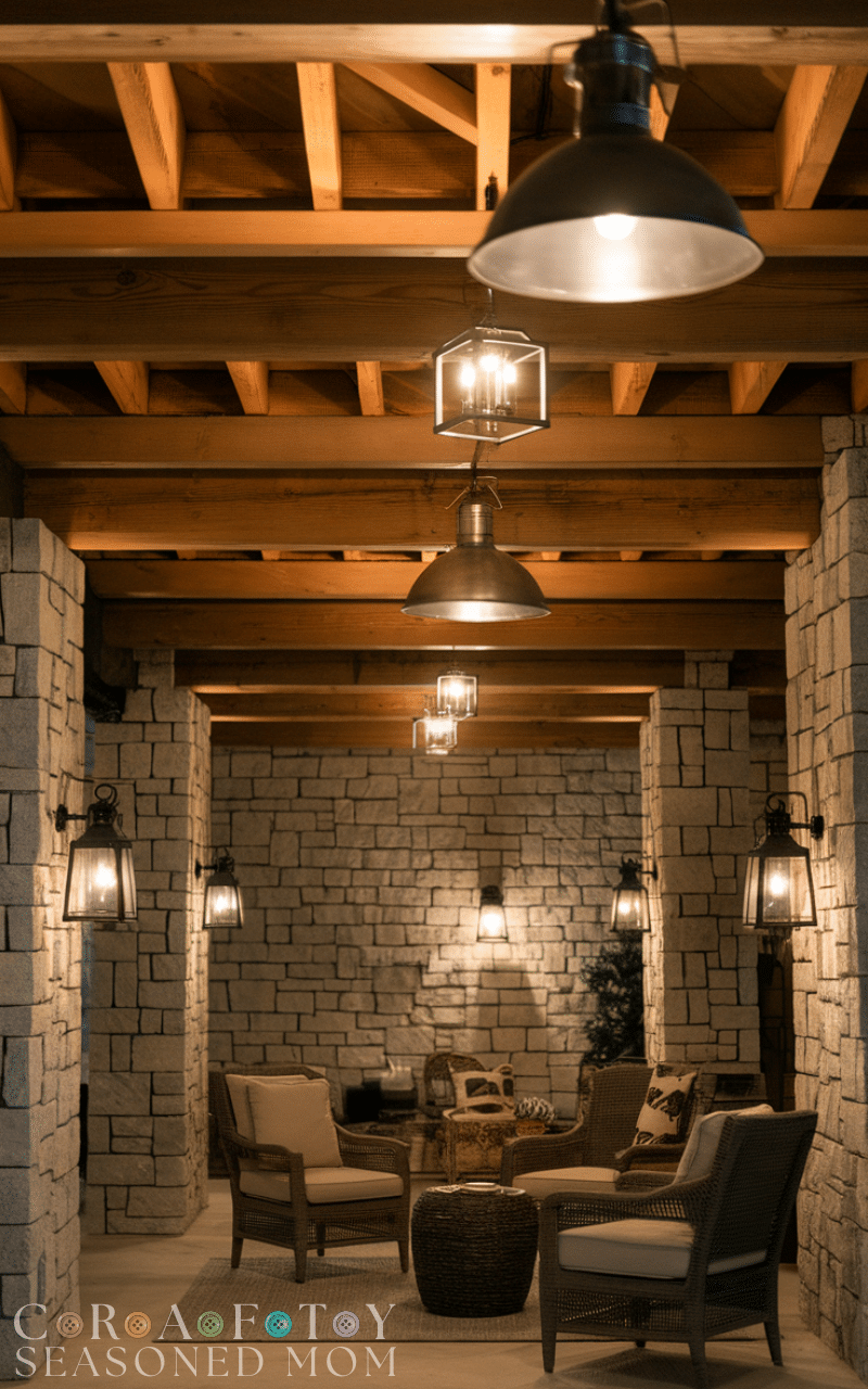 Lighting plays a huge role in rustic basement ideas. Metal pendant lights, lantern-style fixtures, and wall sconces create a cozy glow. Warm bulbs enhance the natural wood and stone textures in the room. Rustic basement ideas benefit from layered lighting, which adds depth and ensures the basement feels bright yet intimate at the same time.