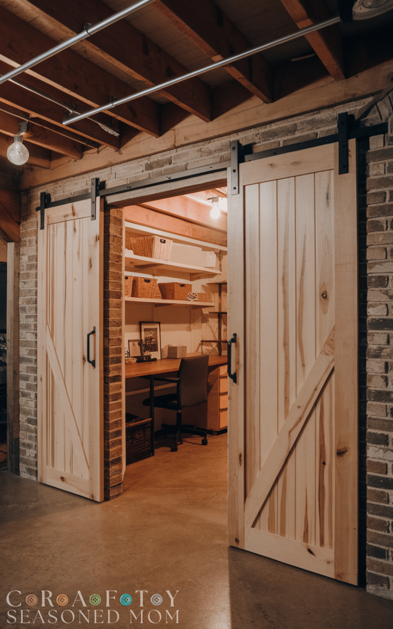 Sliding barn doors are a charming addition to rustic basement ideas. They save space while adding a distinctive farmhouse touch. Choose natural wood finishes with black metal hardware for an authentic look. Rustic basement ideas that include barn doors feel thoughtfully designed and visually interesting, and they work especially well for separating storage areas or home offices within the basement.