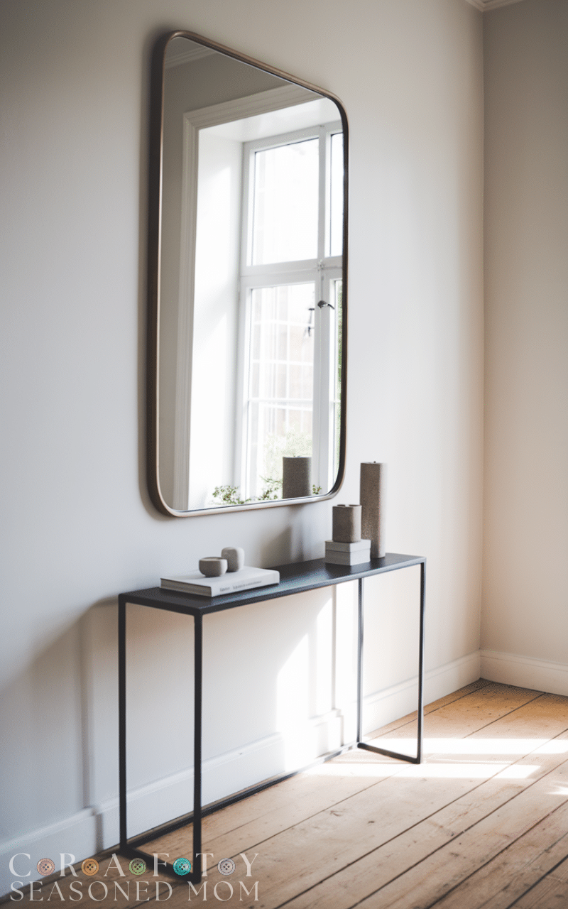 A large mirror is a must in Scandinavian hallway designs. It reflects natural light, makes the space appear bigger, and adds elegance without extra decoration. Choose a simple round or rectangular mirror with a thin frame. Scandinavian hallway designs often use black, wood, or frameless options for a sleek look. Position it above a console table or lean it against the wall for a relaxed feel. This simple addition instantly transforms your hallway into a brighter and more spacious area.