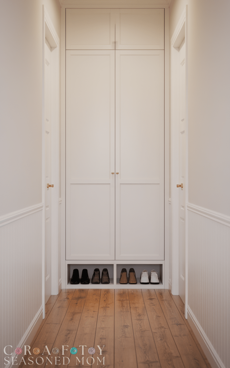 Cluttered shoes can instantly ruin the look of a hallway. Scandinavian hallway designs solve this with slim, closed shoe cabinets that save space. Choose white or light wood finishes to blend with the walls. These cabinets keep everything hidden while maintaining a clean aesthetic. Scandinavian hallway designs always combine beauty and practicality, so opt for models with a narrow depth to suit tight spaces. This smart storage solution keeps your entrance looking neat, structured, and visually light.