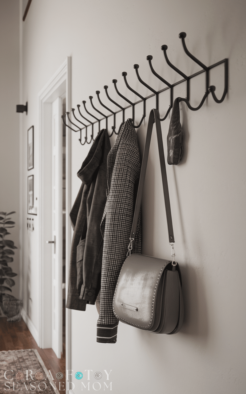 Instead of bulky coat racks, use minimalist wall hooks for a clean and functional solution. Scandinavian hallway designs favor simple shapes in matte black, brushed metal, or natural wood. Install them in a neat row to keep jackets and bags organized. The key is to leave enough empty wall space around them, as Scandinavian hallway designs celebrate breathing room and simplicity. This small detail keeps the entrance tidy and ensures that everyday essentials are accessible without making the hallway look crowded.