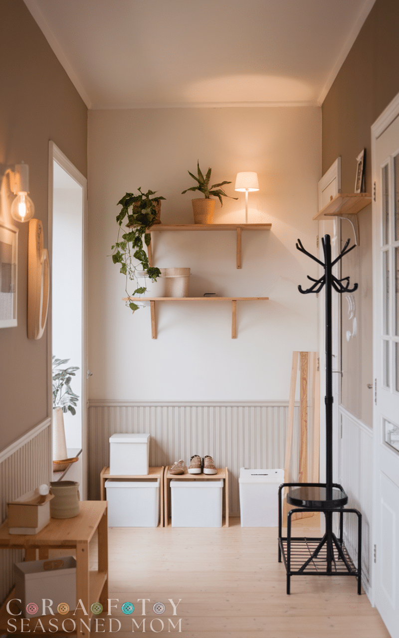 Plants bring life into Scandinavian hallway designs. Choose low-maintenance greenery like small potted plants or hanging planters. Natural elements complement the wood tones and neutral colors typical of Scandinavian hallway designs. Keep the arrangement simple, one or two plants are enough. The goal is to add freshness without overwhelming the space. Greenery softens the clean lines and makes the hallway feel more welcoming and connected to nature.