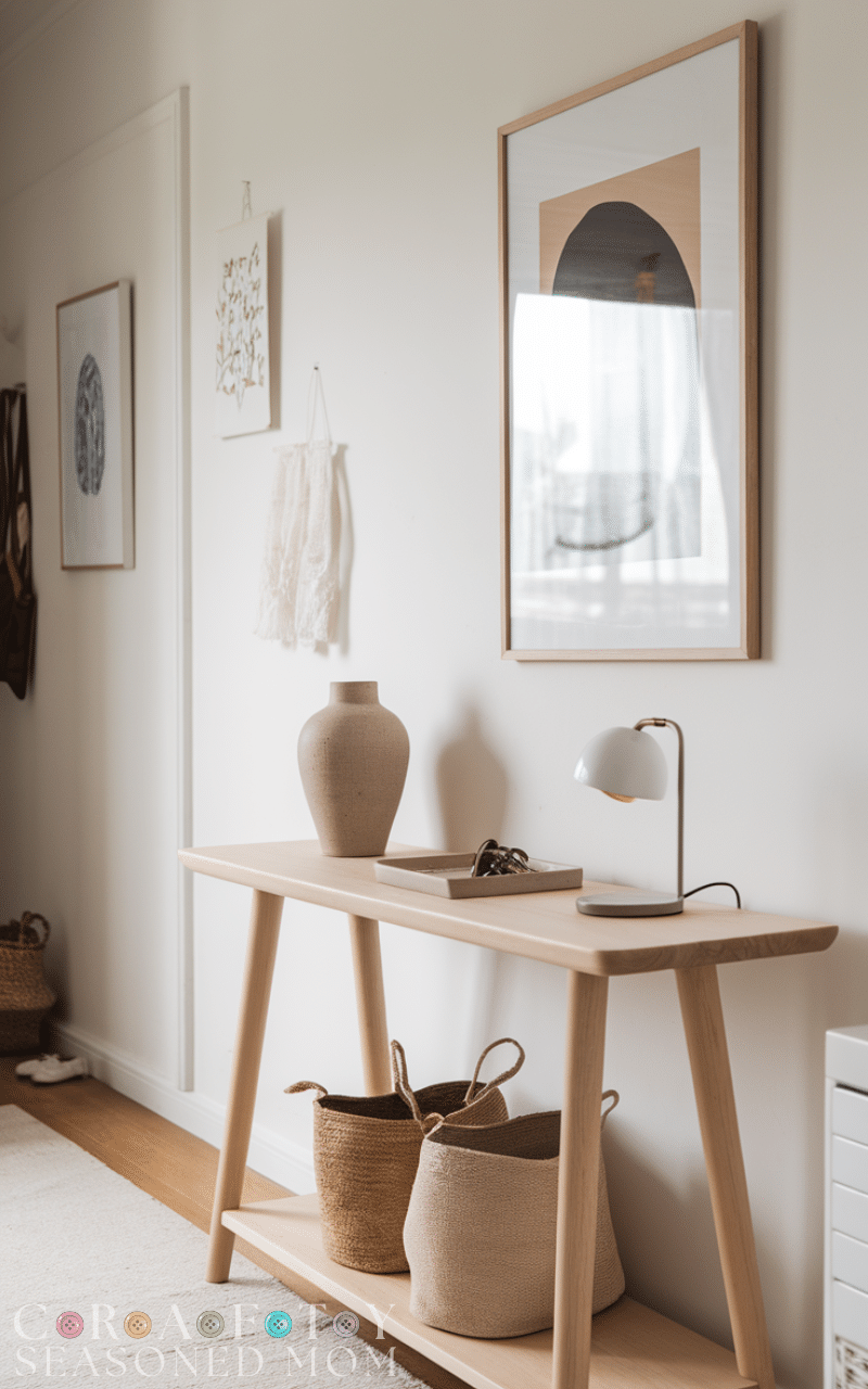 One of the easiest ways to embrace Scandinavian hallway designs is by adding a light wood console table. Choose oak or birch finishes to keep the space feeling natural and airy. Style it with a simple ceramic vase, a small lamp, and a minimal tray for keys. Scandinavian hallway designs focus on balance, so avoid overcrowding the surface. Keep only essential items and let the clean lines shine. This approach makes your hallway look organized, warm, and effortlessly welcoming from the moment you walk in.
