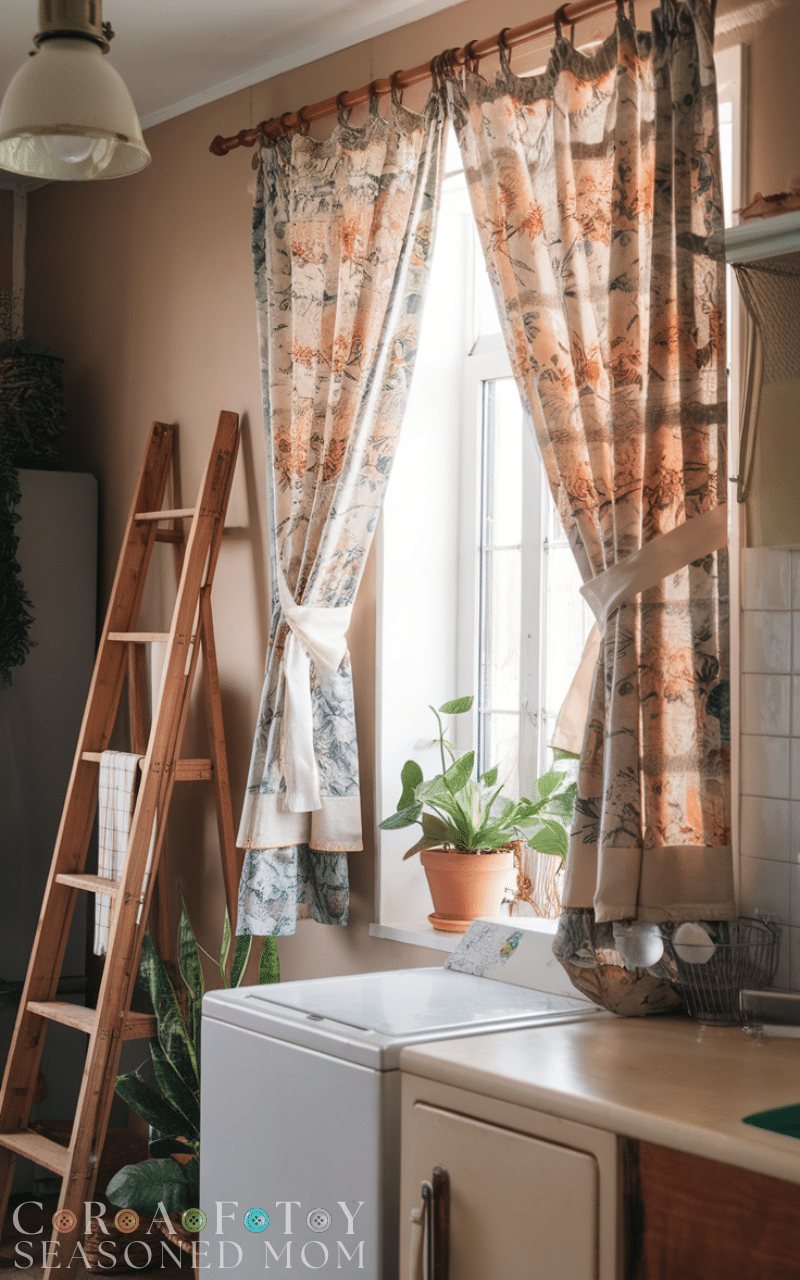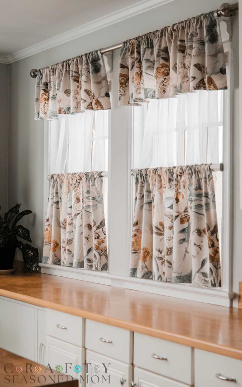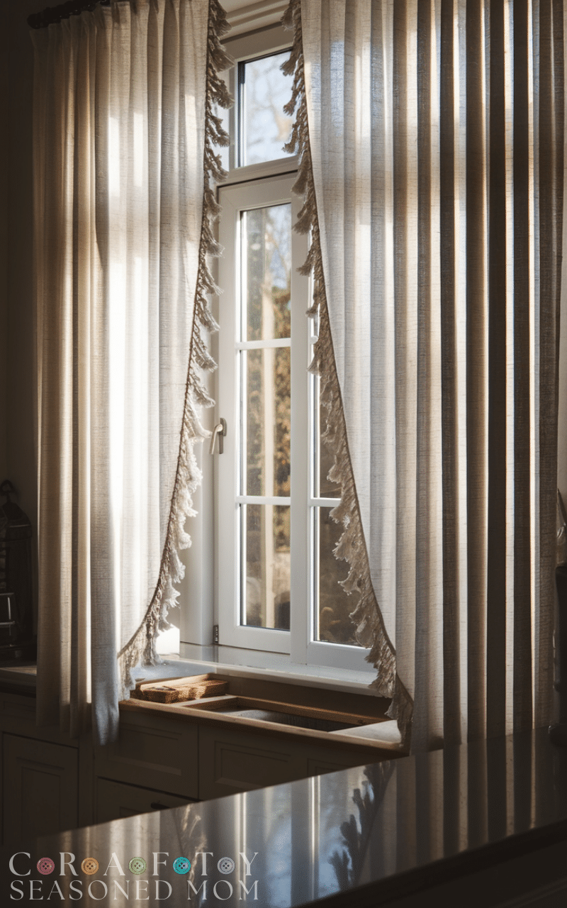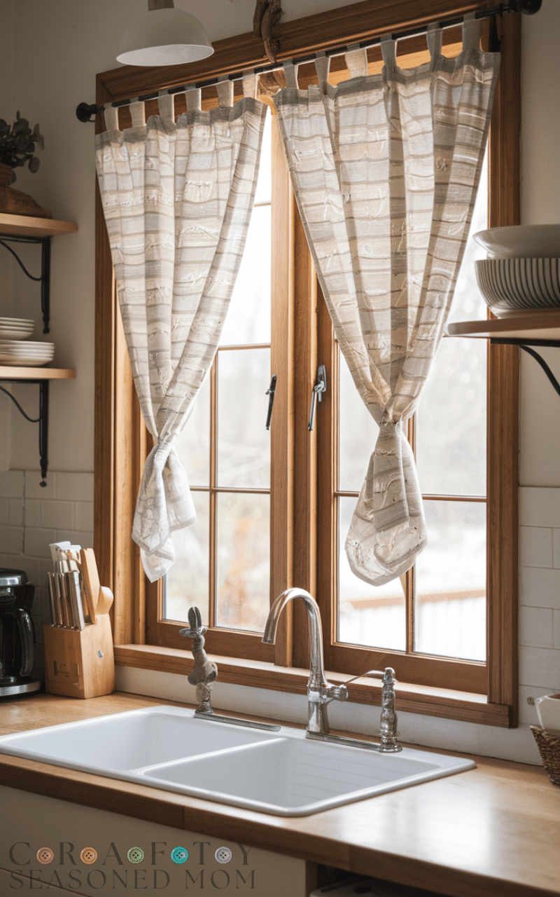 DIY upcycled curtains are a fun and eco-friendly option for kitchen window treatments and you can use old fabrics or sheets to create unique curtains and they allow you to personalize your kitchen and add charm without spending much money and they are simple to sew or tie and you can mix and match colors and patterns for a playful look and they are easy to wash and update whenever you like and they are perfect for creative kitchens and your kitchen window treatments will be one-of-a-kind and express your style making your kitchen warm and inviting.