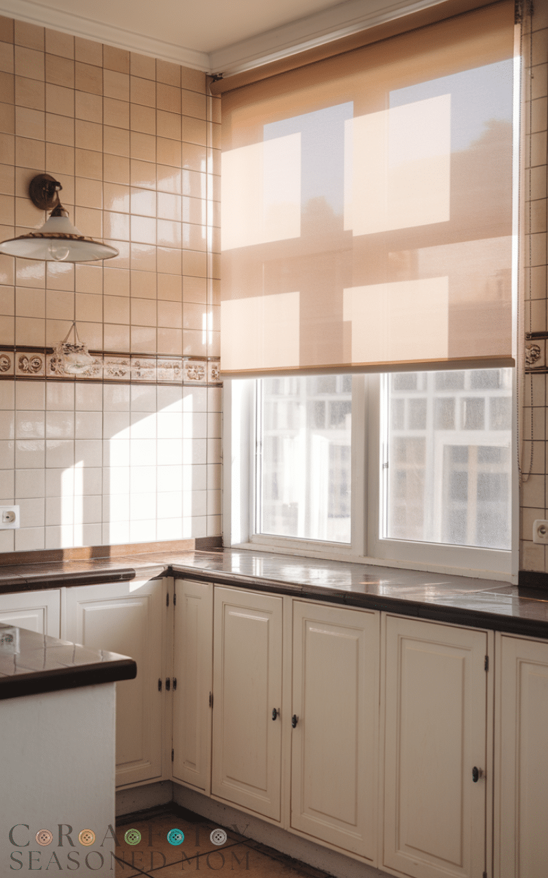 Combo shades that mix roller and Roman styles are creative kitchen window treatments and they give you the flexibility to have full privacy or soft filtered light depending on your mood and they come in many fabrics and patterns to match your kitchen décor and they are easy to operate and maintain and they create a layered and stylish look without cluttering the space and they are perfect for modern kitchens and small or large windows and your kitchen window treatments will feel contemporary and elegant with these versatile combo shades enhancing the atmosphere.