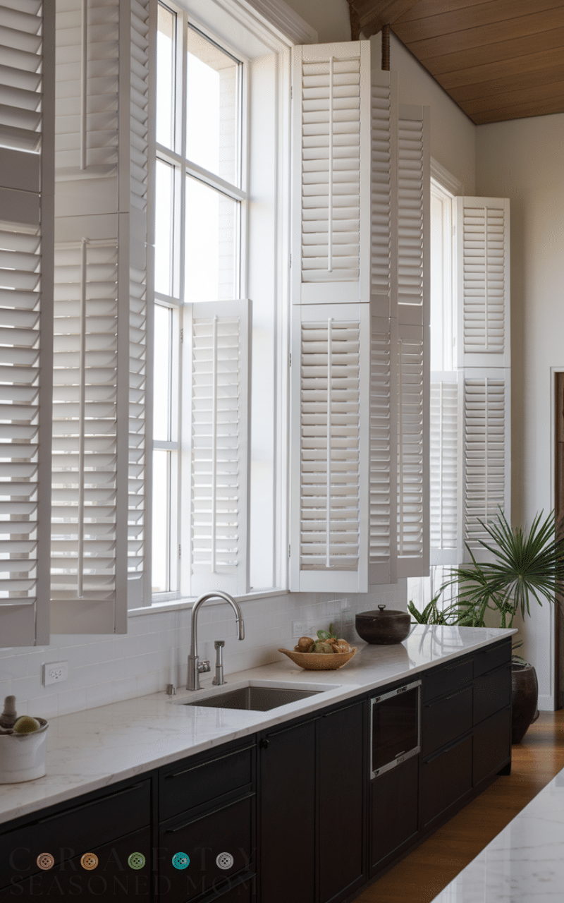 Plantation shutters are a sophisticated choice for kitchen window treatments and they provide excellent light control and privacy and they are durable and can last for years while adding value to your home and they are easy to clean and maintain and they fit any window shape and size and they bring a classic yet modern look to your kitchen and they can be painted or stained to match your décor and your kitchen window treatments will feel polished and elegant with plantation shutters making your space more stylish and functional.