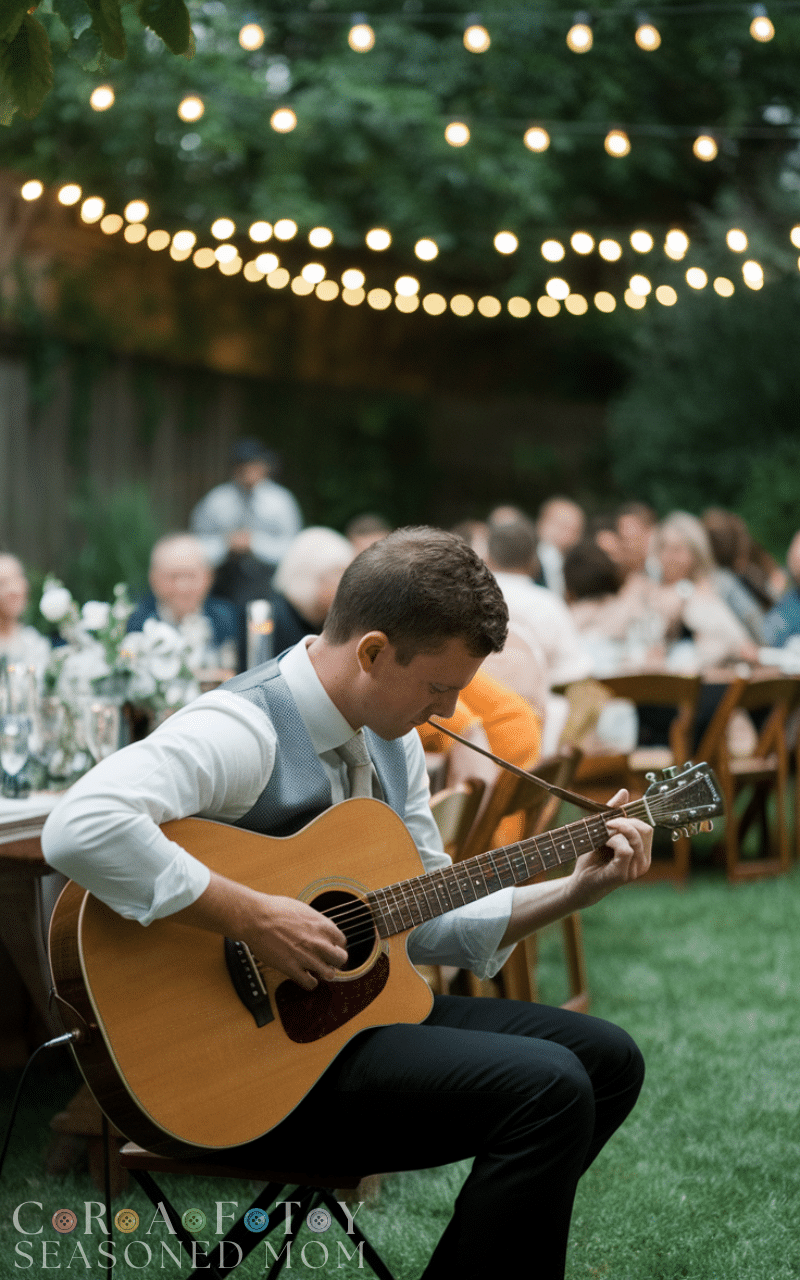 Hire a local guitarist or violinist or even ask a musically talented friend to play during the ceremony. Live music makes a small backyard wedding intimate and emotional because the sounds fill the open air naturally. Soft melodies during dinner or vows make guests feel calm and connected creating moments that touch everyone’s hearts.