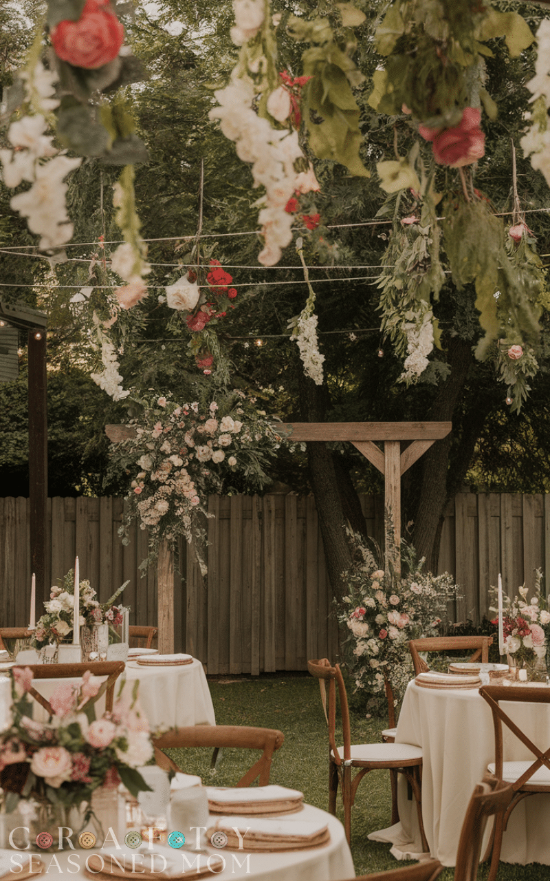 Instead of filling the ground with décor try hanging flowers and greenery overhead. For a small backyard wedding this trick adds beauty without crowding the space. Suspended blooms above tables or over the ceremony spot draw the eyes upward and make the entire setting feel lush and enchanting like a secret garden come to life.