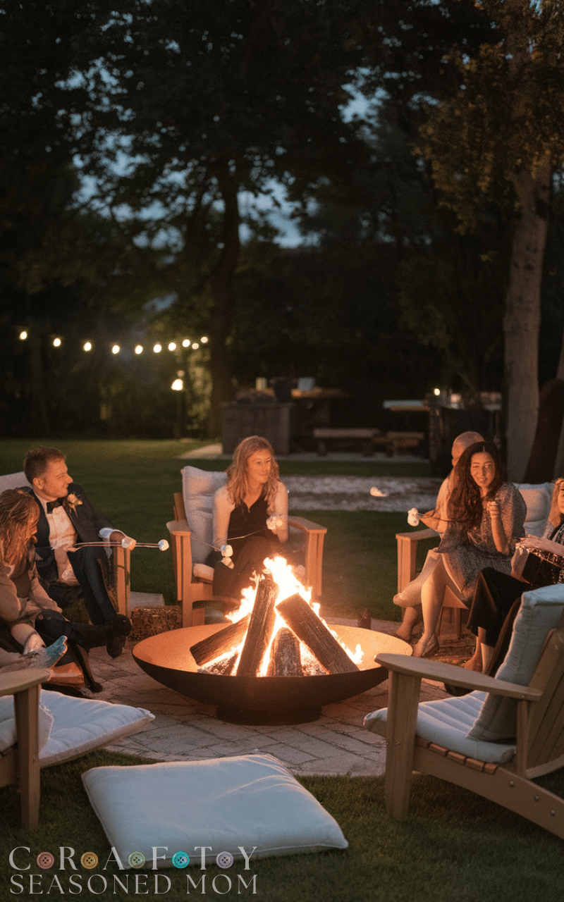 If your wedding continues into the evening a fire pit area adds warmth and comfort to your small backyard wedding. Arrange comfy chairs or floor cushions around the fire and let guests enjoy roasting marshmallows or chatting under the night sky. It creates an unforgettable cozy corner where laughter and love mix in the most relaxed and romantic way.