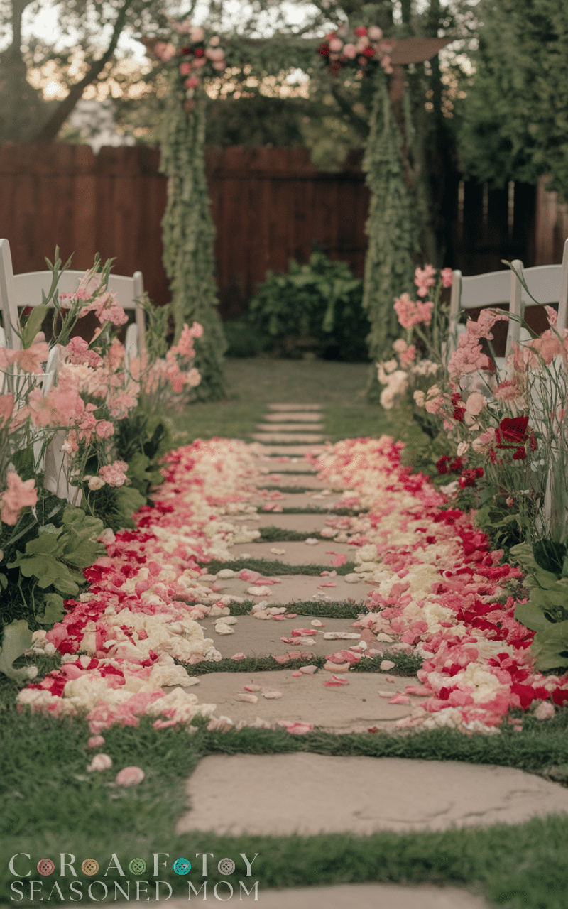 Line the walkway with fresh flowers or petals to create a romantic path for the bride and groom. For a small backyard wedding this simple idea adds color and life without taking much space. It gives the ceremony a fairy-tale atmosphere and makes the entrance truly unforgettable as everyone watches the couple walk through blooms that symbolize love and new beginnings.