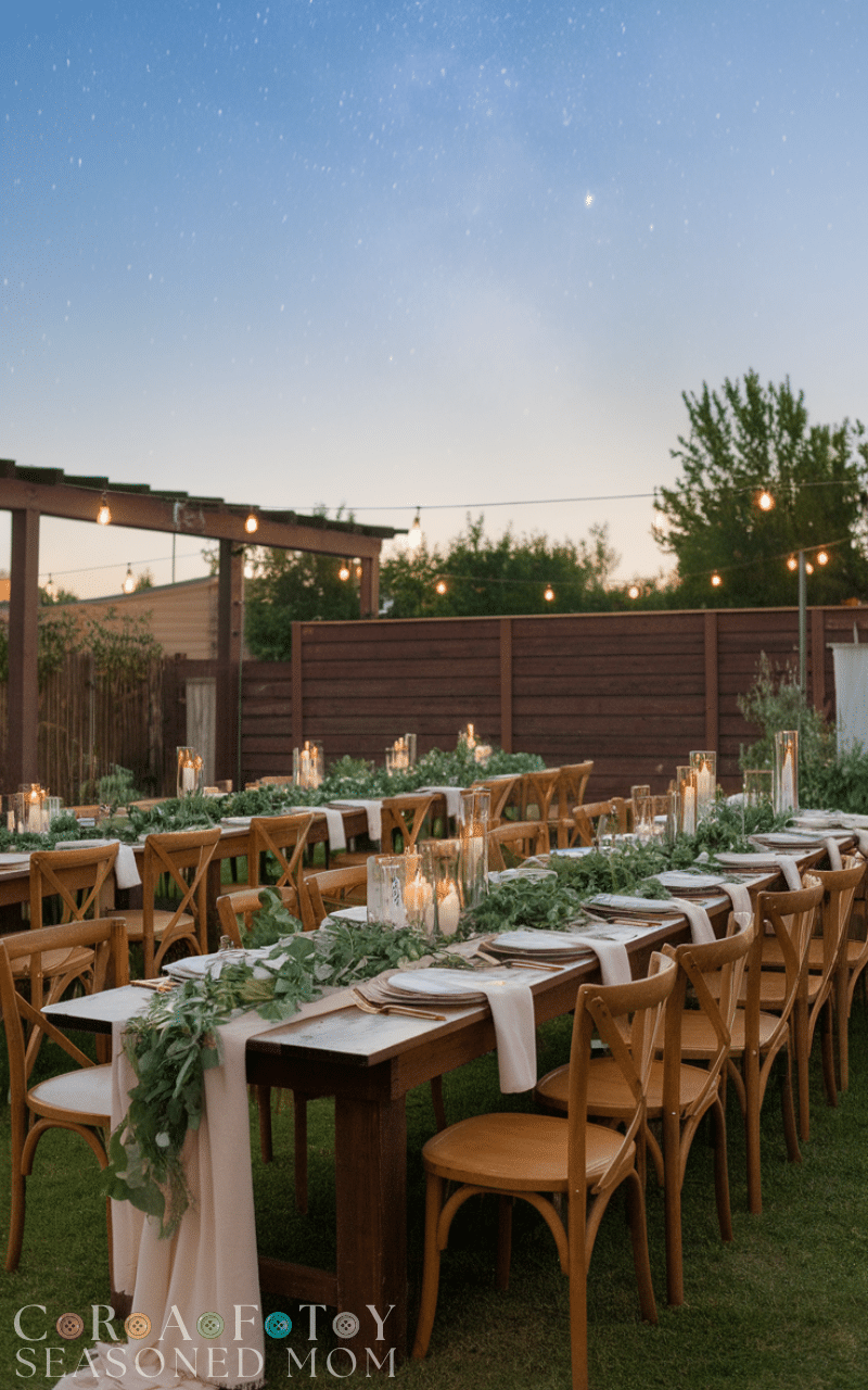 For a small backyard wedding long wooden tables create a sense of togetherness where everyone feels connected. You can decorate them with greenery simple candles and soft fabrics for a charming farmhouse style. This setup makes dining feel cozy and intimate and it encourages guests to talk laugh and share the moment together as one big family celebrating love in your backyard under the stars.