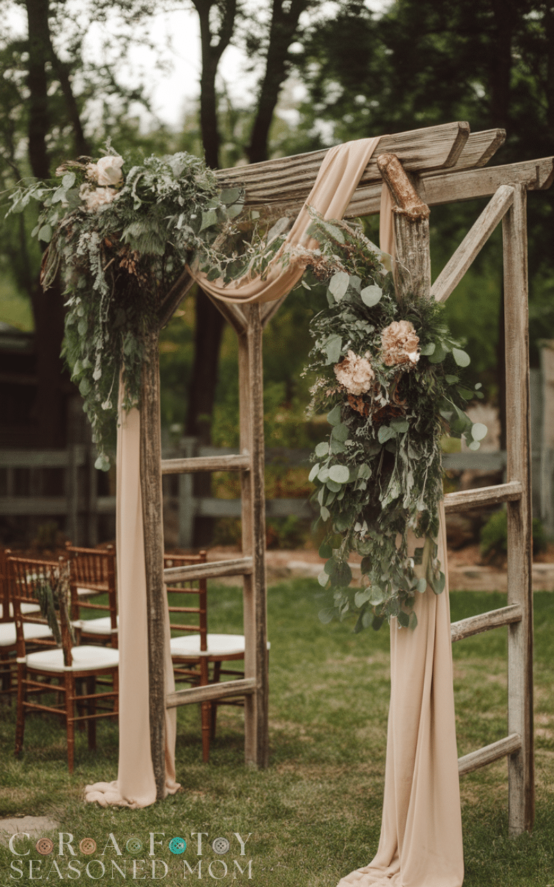 A rustic wooden arch decorated with flowers greenery and fabric makes a beautiful focal point for your small backyard wedding. It gives the ceremony a natural and elegant touch while adding structure to your space. You can build one yourself using reclaimed wood or rent one for a simple yet stunning setup. It frames the couple perfectly for photos and makes the moment you say “I do” feel even more special under the open sky surrounded by nature and love.