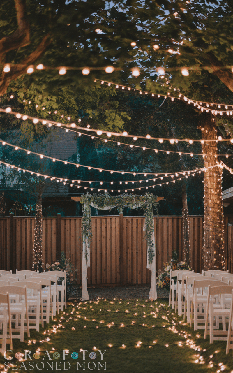 Create a dreamy glow above your guests with strings of fairy lights that stretch across your backyard. For a small backyard wedding these lights make everything look cozy and romantic especially when the sun goes down. You can hang them from trees fences or poles to give the entire space a warm and welcoming vibe and every sparkle will make your evening photos look magical so this idea truly transforms your backyard into a twinkling paradise filled with charm and light.
